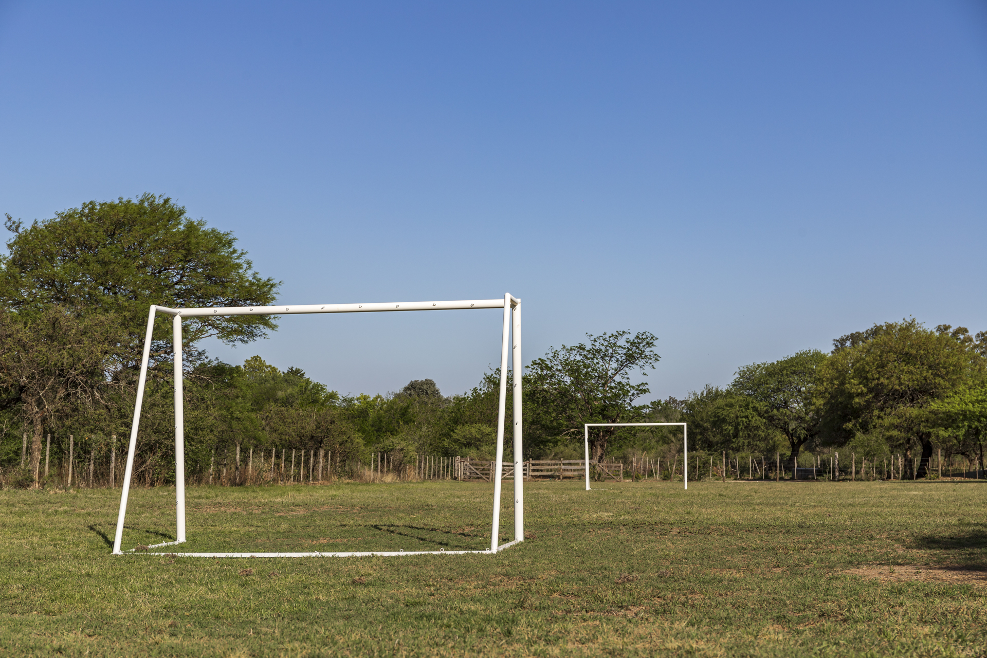 Cancha de cemento para jugar recreativamente al tenis y arcos removibles para disfrutar de tardes de fútbol.
